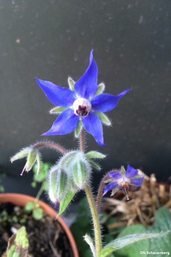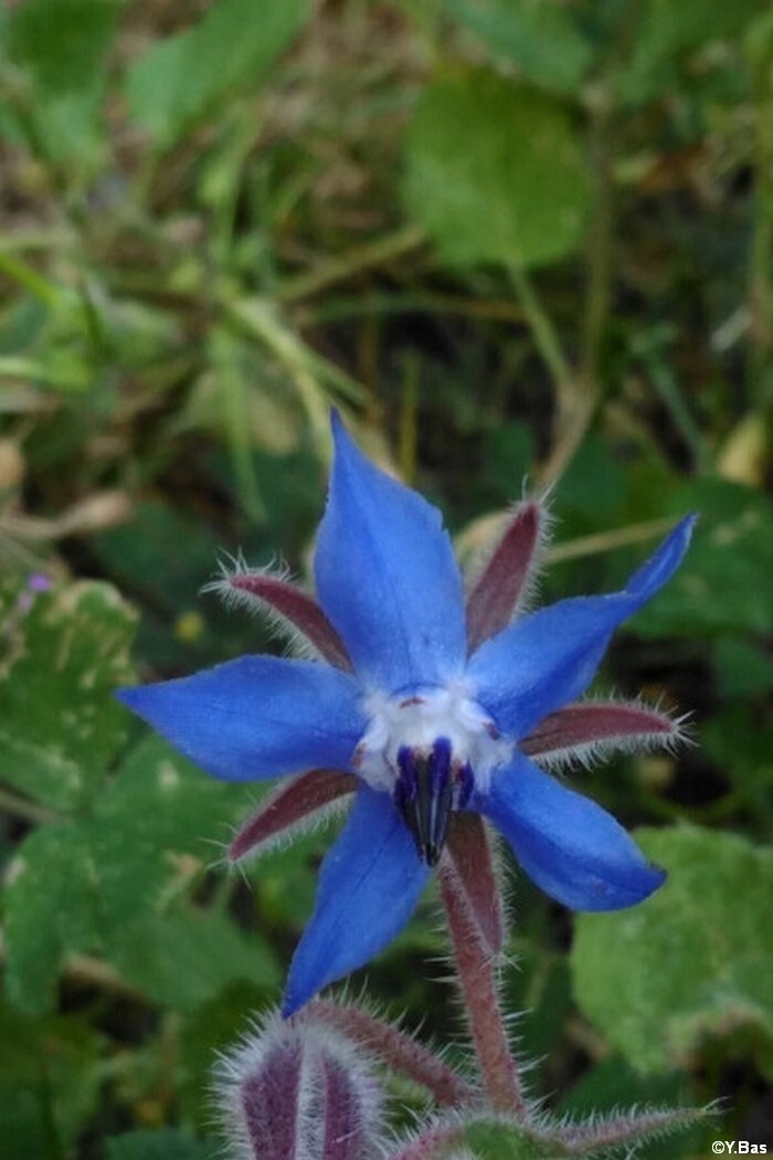 Plante à tige cylindrique épaisse et dressée de 20 à 60 cm de haut. Les feuilles sont ridées et toute la plante est recouverte de poils courts et durs. Les fleurs forment une étoile bleu-violet. Les fleurs sont renversées et tournées vers le sol.