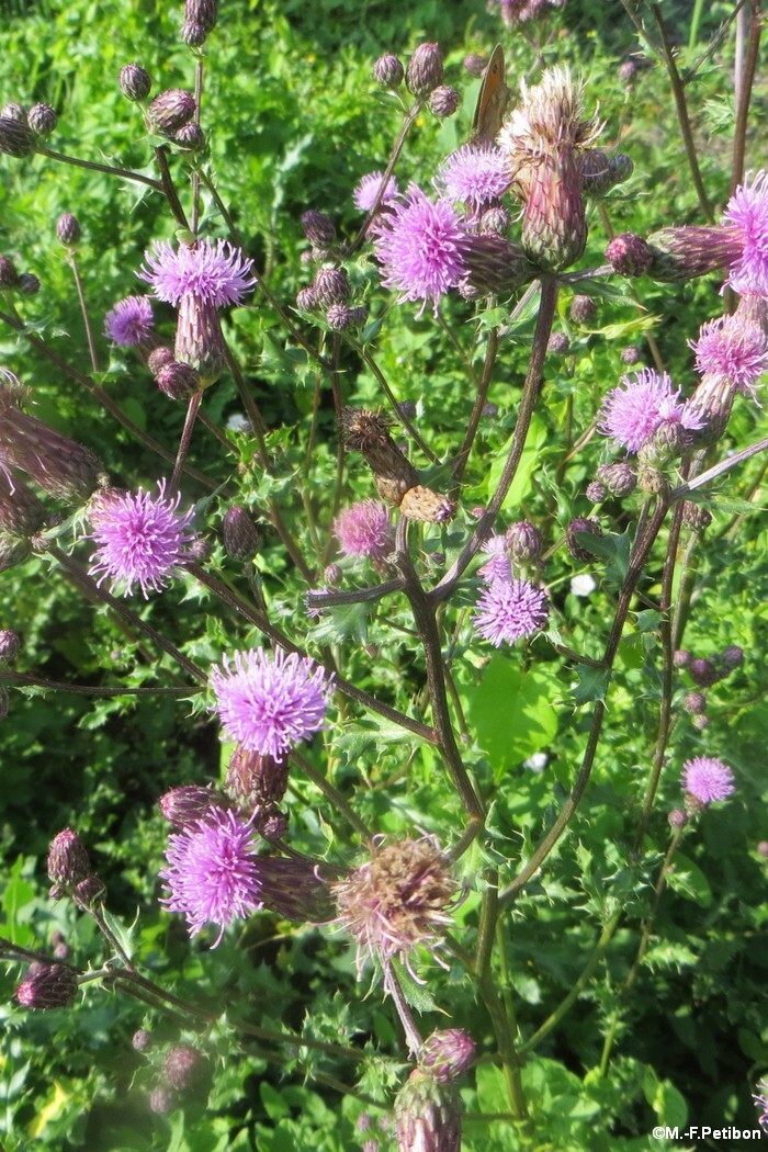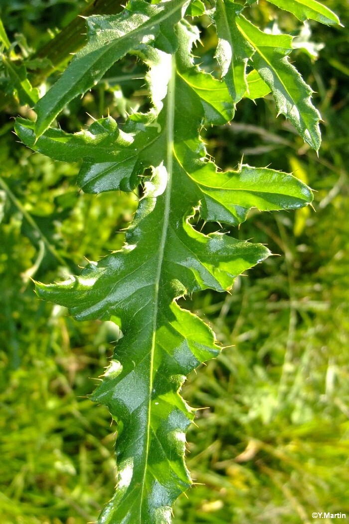 Chardon pouvant mesurer jusqu'à 1 m 50 de haut. Ses feuilles ont peu de poils mais de nombreuses épines. Sa tige est velue mais n'a pas d'épines. Les fleurs sont regroupées en capitules rose violacés de 2 cm de diamètre environ.