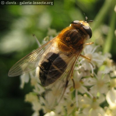 Thorax fauve, velu. Abdomen noir avec une série de 3 bandes bleu pâle.